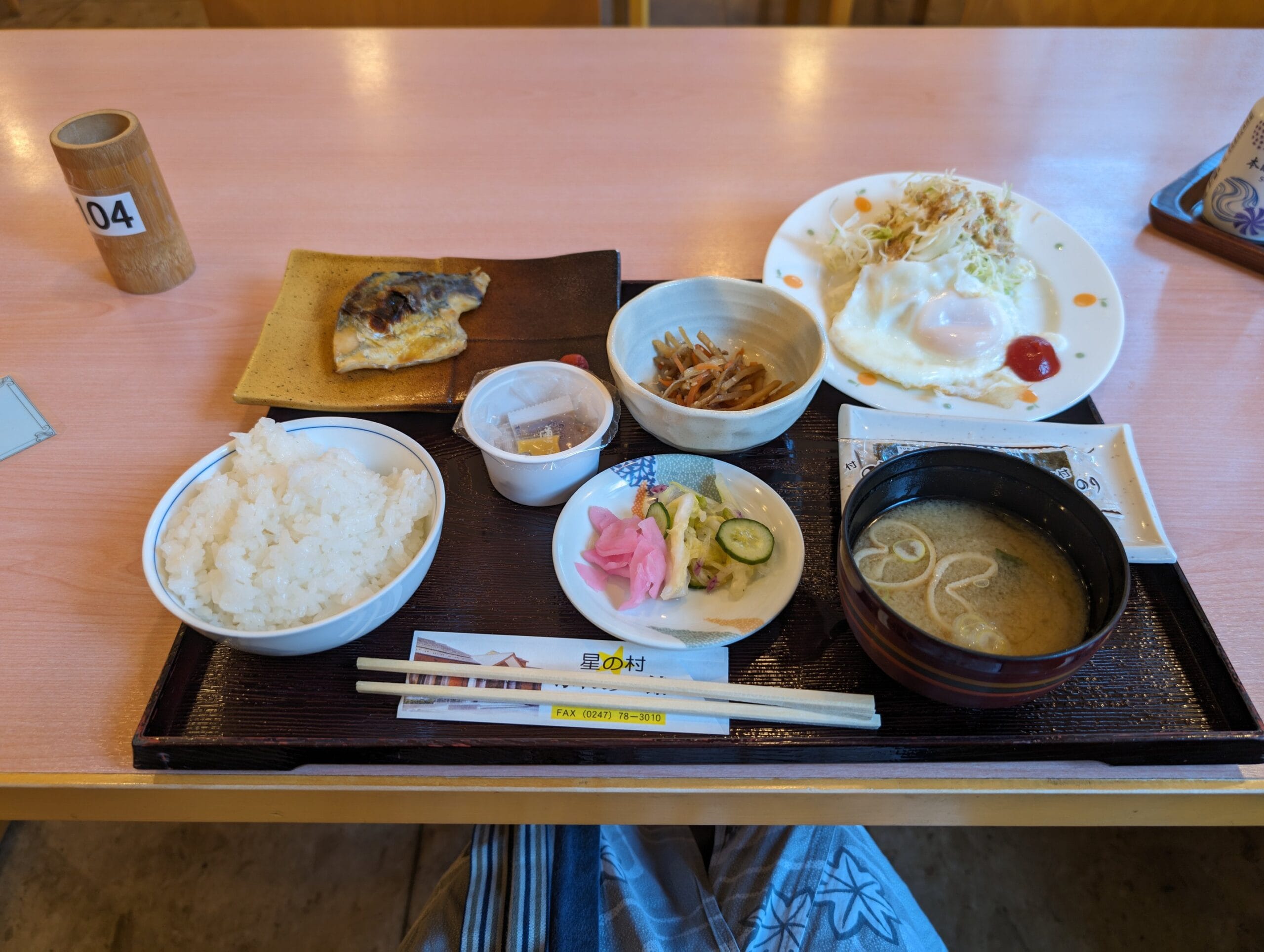 The breakfast at the hotel offers a traditional Japanese home-style experience. It primarily consists of fish, eggs, rice, and soup, which are staple components of a classic Japanese breakfast.